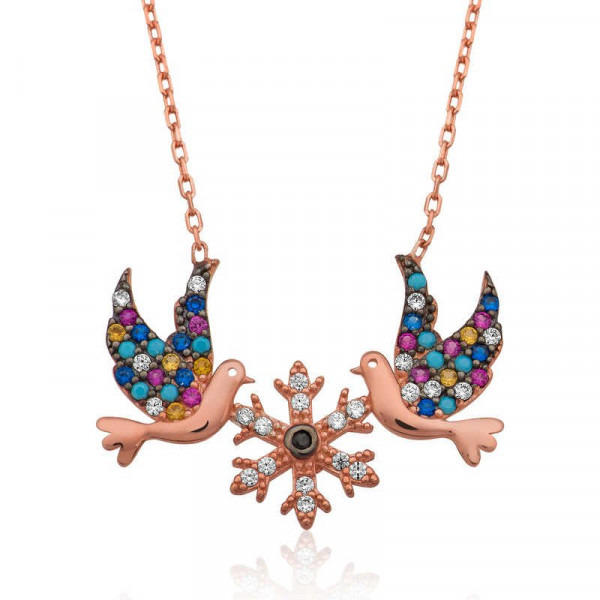 Kadınların boyunlarını ortaya çıkaran ve kıyafetlerini çok daha belirgin hale getiren kolyeler, aksesuarlar arasında vazgeçilmezler arasındadır. Gümüş aşk kuşları kolye yeni yıl, 14 Şubat sevgililer günü ve doğum günü gibi özel günlerde tercih edilebilecek en anlamlı hediye seçeneklerinden biridir. Kaliteli ve şık gümüş kolyeleri satın almak hayal olmaktan çıktı. 925 ayardan üretilen bu şık gümüş kolye üzerine rose altın kaplama yapılmıştır. Rose altın kaplama yapılan gümüş bayan kolyeler parlaklığını uzun süre muhafaza eder ve oksitlenmesi gecikir, gümüşe bakır rengini verir. Tüm kolyelerde olduğu gibi gümüş aşk kuşları kolye modeli de el emeği ile üretilmiştir. Gümüş ve değerli taşlar nedeniyle belirtilen ortalama ürün ağırlığında ± %10 sapma olabilmektedir.