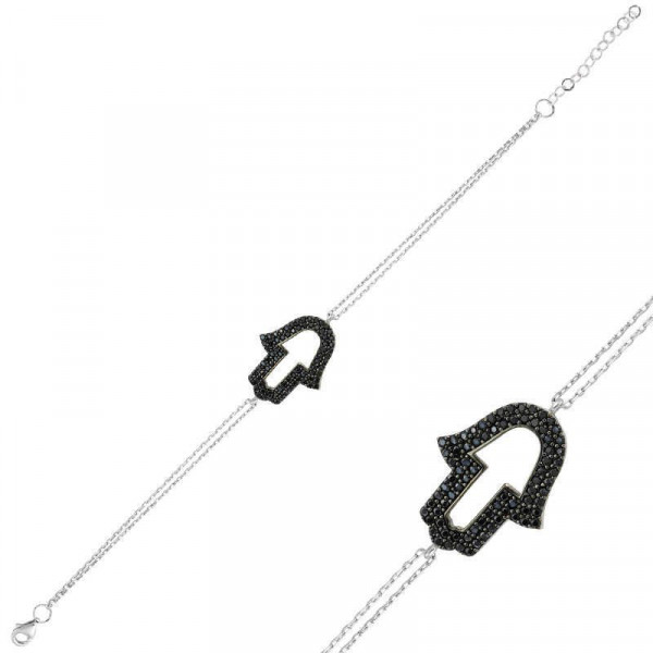 Hz. Fatma'nın Eli olarak bilinse de arapça'da “hamse” diye anılır. Hamse, beş anlamına gelir ve bir elin parmak sayısını gösterir. Hz. Fatma bir gün mutfakta helva kavururken, eşi Hz. Ali görür ve pişen helvaya elini daldırır ancak hiç bir şey olmaz, helvayı böyle kavurmayı devam eder. O günden sonra elinin kutsallığına, gücüne adeta yenilmezliğine inanılır. Her güçlük adeta onun eliyle aşılacaktır. Bu harika tasarım siyah taşlı Fatma eli bayan bileklik modeli 925 ayar gümüş ile imal edilmiştir. Bileklik üzerinde bulunan siyah taşlar zirkondur. Bileklik uzunluğu bilek kalınlığına göre ayarlanabilmesini sağlayan uzatma zinciri vardır. En fazla 21 cm’ye kadar uzayabilir. Bütün gümüş bayan bileklik modellerimiz el emeği ile üretilmiştir. Gümş ve değerli taşlar nedeniyle belirtilen ortalama ürün ağırlığında ± %10 sapma olabilmektedir.